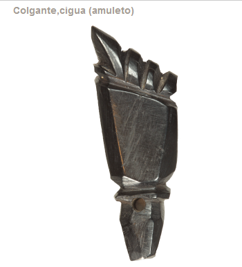 Sin duda, la pieza popular por excelencia, ligada a esta materia prima como elemento protector en la península ibérica ha sido la higa de azabache. Esta iconografía gestual de la mano fue muy utilizada en el mundo clásico, y fechas anteriores, en Oriente Medio y Próximo, entre otras cosas, asociada a la defensa contra el denominado “mal de ojo” o “fascinación” realizada en todo tipo de soportes y materiales y también era habitual reproducir este gesto, con el pulgar entre el dedo índice y el corazón, como método de defensa. Fue introducida en la península de la mano de los fenicios, y muy utilizada en Época Romana, donde también se vincula con la representación de la vulva femenina, por lo que era habitual su representación en diversos tipos de amuletos fálicos. En el mundo musulmán el “mal de ojo” también tenía un peso importante usando en el norte de áfrica un amuleto protector en forma de mano abierta, la hamsa que también se introdujo en la península ibérica. Las higas de azabache más antiguas hasta la fecha han sido datadas por el momento en el siglo XIII. Con el tiempo se convierten en imprescindibles amuletos, muy arraigados en la sociedad, relacionados con la protección contra el “aojamiento”, muy vinculado al mundo infantil, uniendo el carácter protector de la materia prima, con el ofensivo de la forma gestual de la mano aunando en una misma pieza elementos protectores pasivos y activos. Este elemento es utilizado por todas las clases sociales en múltiples formatos y tamaños, costumbre que ha llegado a nuestros días, con la creencia de que el amuleto atraía la mirada del “aojador” protegiendo así al portador. Las primeras, más sencillas y de pequeño tamaño, fueron evolucionando a partir del siglo XVI hacia piezas más estilizadas que enmascaraban su forma llegando a las grandes piezas utilizadas en el siglo XVII, cubiertas de simbología religiosa o compostelana, que pretendían ocultar la gestualidad pagana, ya que las autoridades condenaban su uso, a menudo vinculando estos objetos con la influencia morisca. Sin embargo también era muy utilizada por miembros de los estamentos religiosos y se localizan en enterramientos de congregaciones religiosas en formatos muy variados, incluso dobles, triples, cuádruples o hasta séxtuples. Prueba de su arraigo social es la representación constante de estos elementos en los retratos de infantes del siglo XVII. La mortalidad infantil era muy alta y solían portar cinturones de los que colgaban decenas de amuletos de todo tipo, y otros eran cosidos en la ropa. Paulatinamente la higa recupera su forma primitiva en forma de pequeños dijes a partir del siglo XVIII.