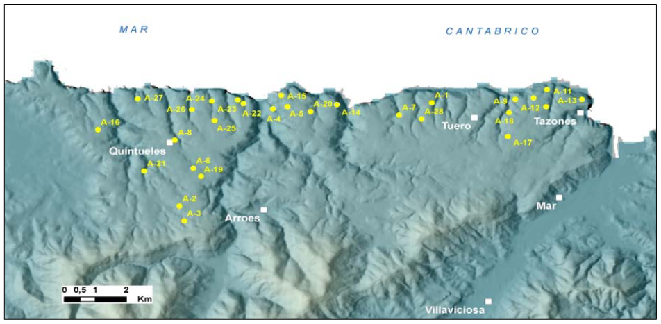 Localización de antiguas explotaciones abandonadas de azabache entre Gijón y Villaviciosa. Fuente: IGME: Mapa de Rocas y Minerales Industriales de Asturias: Web