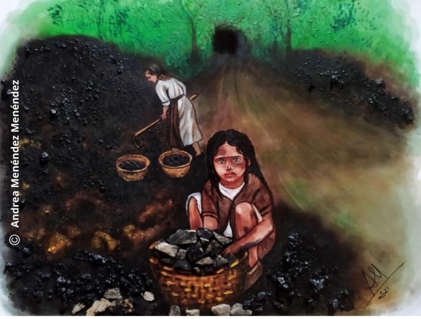 Trabajo de mujer y niña escogiendo materiales de la escombrera. Ilustración con texturizado de polvo y fragmentos de azabache. Autor: Andrea Menéndez Menéndez